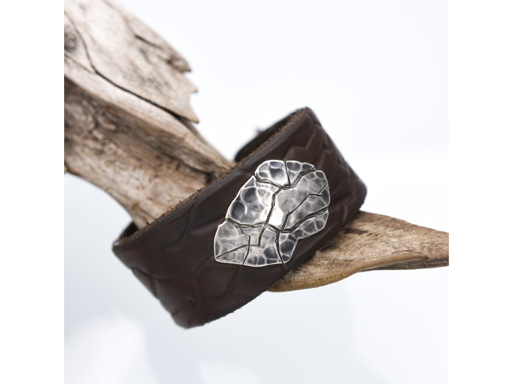 Tmavě hnědý kožený náramek se stříbrným zdobeným motivem prasklin, patinováno do tmava.