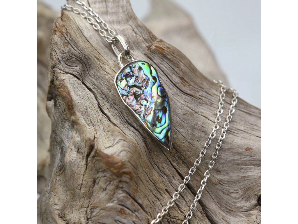 Paua perleť s výraznou modrozelenou hrou barev jsem osobně vybral na svých cestách za dobrodružstvím a poklady. Každý kousek nese vlastní kresbu, která z něj dělá originální dar přírody. Perleť jsem ručně zasadil do stříbra a dobrousil tak, aby přívěs působil lehce a příjemně při každodenním nošení.