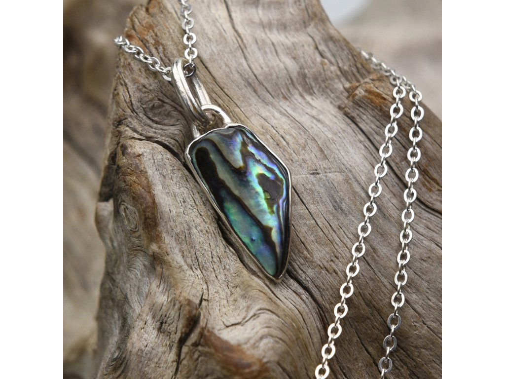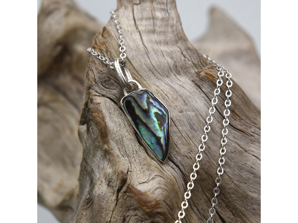 Paua perleť s výraznou modrozelenou hrou barev jsem osobně vybral na svých cestách za dobrodružstvím a poklady. Každý kousek nese vlastní kresbu, která z něj dělá originální dar přírody. Perleť jsem ručně zasadil do stříbra a dobrousil tak, aby přívěs působil lehce a příjemně při každodenním nošení.