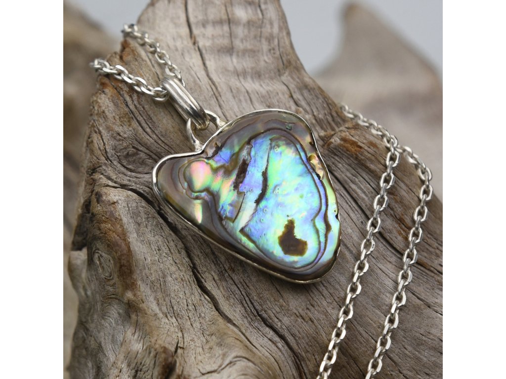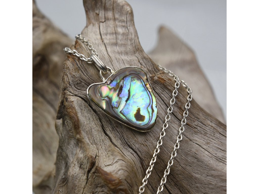 Paua perleť s výraznou modrozelenou hrou barev jsem osobně vybral na svých cestách za dobrodružstvím a poklady. Každý kousek nese vlastní kresbu, která z něj dělá originální dar přírody. Perleť jsem ručně zasadil do stříbra a dobrousil tak, aby přívěs působil lehce a příjemně při každodenním nošení.