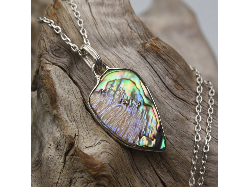 Paua perleť s výraznou modrozelenou hrou barev jsem osobně vybral na svých cestách za dobrodružstvím a poklady. Každý kousek nese vlastní kresbu, která z něj dělá originální dar přírody. Perleť jsem ručně zasadil do stříbra a dobrousil tak, aby přívěs působil lehce a příjemně při každodenním nošení.
