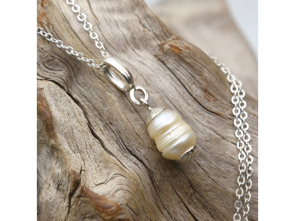 Říční perly (fresh water pearls) jsem osobně vybral na svých cestách po Indonésii, kde mě zaujaly svou přirozenou krásou a nepravidelnými tvary. Každá perla má vlastní charakter a jemnou perleť, díky které je každý šperk originální kousek přírody. Perly jsem ručně zasadil do stříbra a upravil tak, aby přívěs působil na krku lehce, elegantně a příjemně při každodenním nošení.